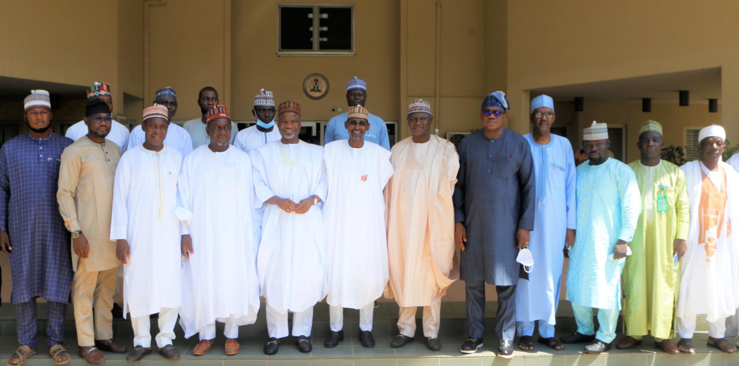 FCT Minister, Malam Muhammad Musa Bello (6th left) flanked by Former Minister of State for Mines and Steel Development, Hon. Abubakar Bawa Bwari (5th left) Speaker, Niger State House of Assembly Rt Hon.Abdullahi Bawa Wuse (7th left) Permanent Secretary, FCTA, Mr Olusade Adesola (8th left) and other officials of the FCTA with a delegation of stakeholders from Tafa Local Government Area of Niger State during the delegation’s visit to the FCTA