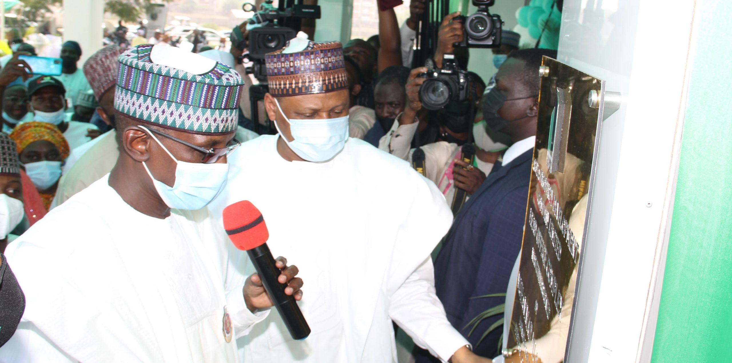 FCT Minister, Malam Muhammad Musa Bello cutting the tape to commission the new office complex of the Abuja Property Development Company (APDC) on Friday, 03/12/2021