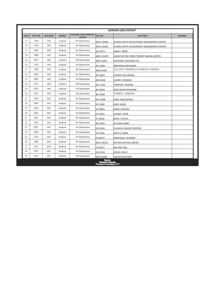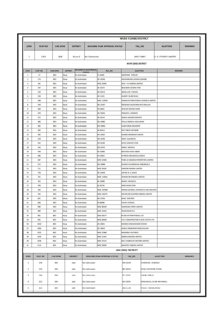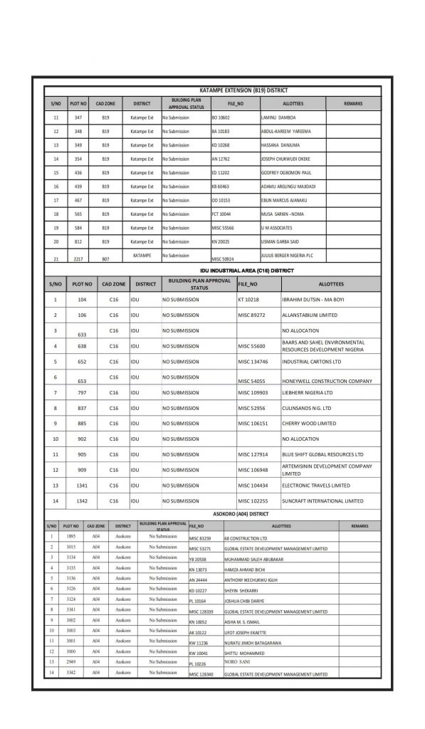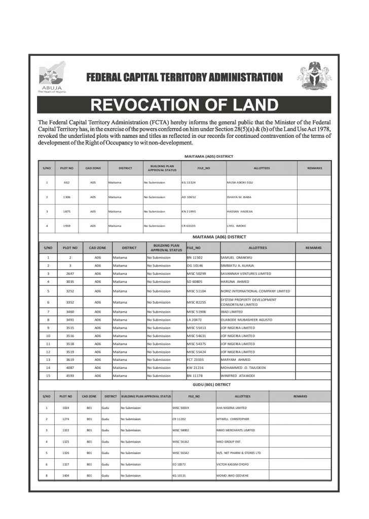 The Federal Capital Territory Administration (FCTA) hereby informs the general public that the Minister of the Federal Capital Territory has, in the exercise of the powers conferred on him under Section 28(5)(a) & (b) of the Land Use Act 1978, revoked the underlisted plots with names and titles as reflected in our records for continued contravention of the terms of development of the Right of Occupancy to wit non-development.